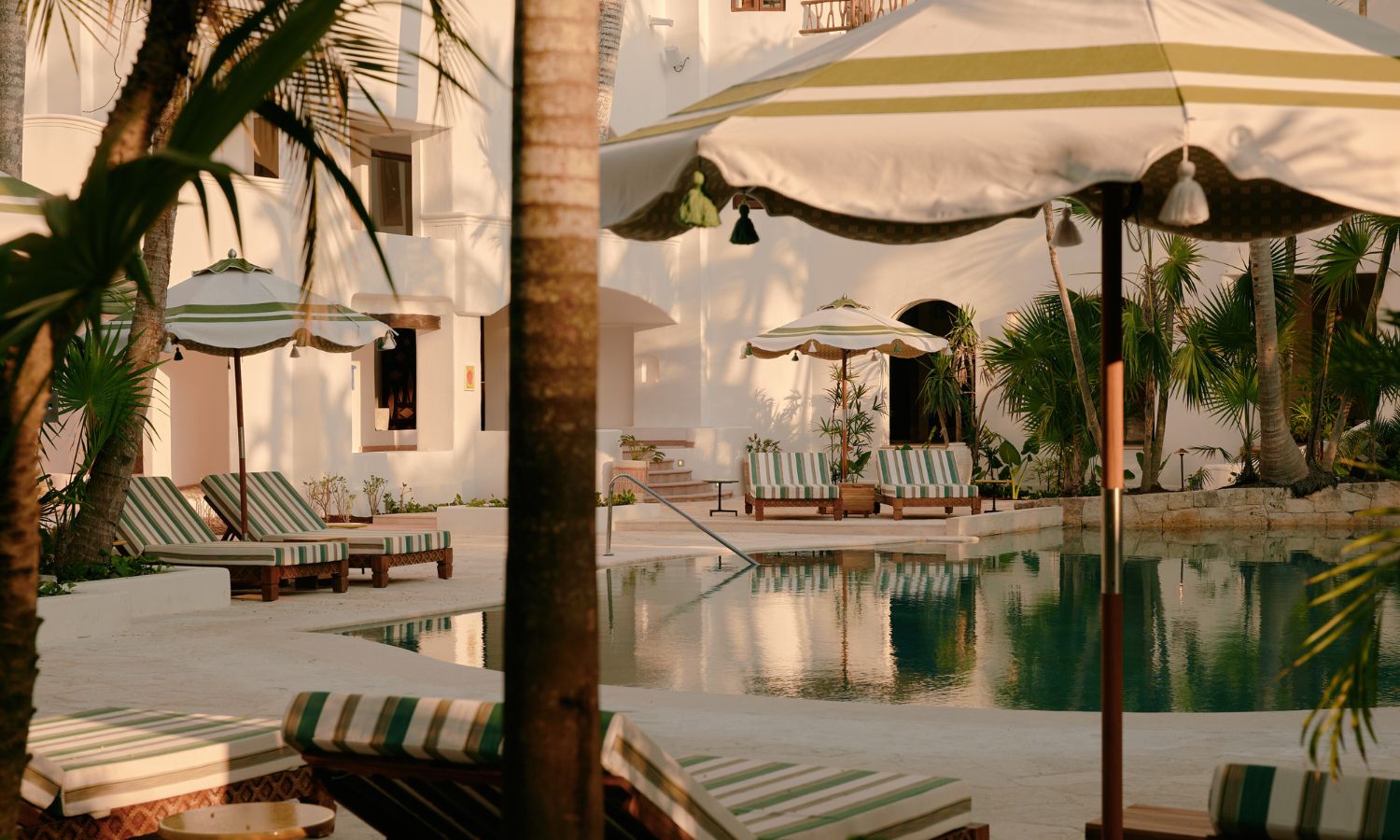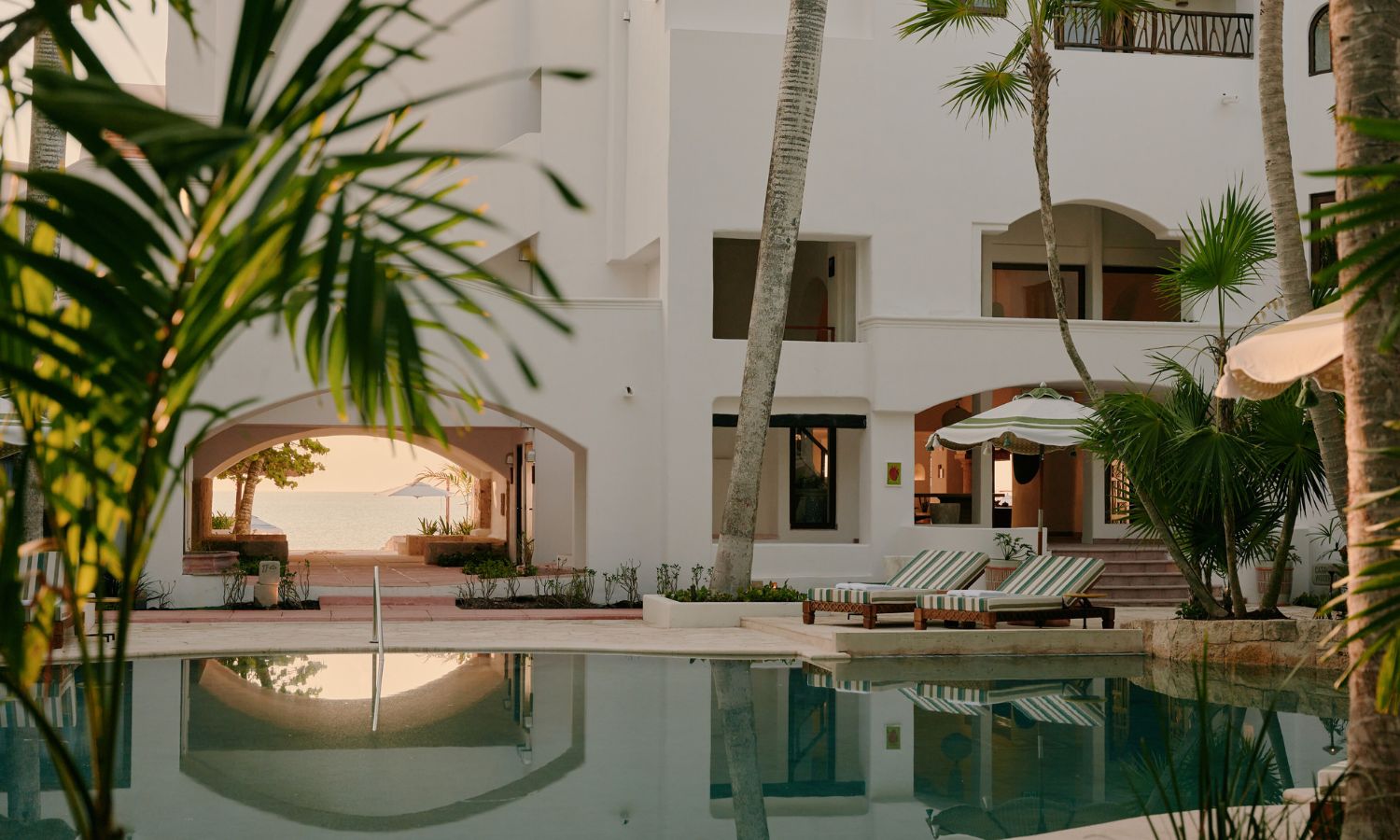 Curved lines, organic forms and views of the glimmering Caribbean Sea beyond inspire a feeling of being aligned with nature. The property’s three pools have also been redesigned to feature Sukabumi tiles, handmade from volcanic stone, in the same turquoise as the region’s cenotes.