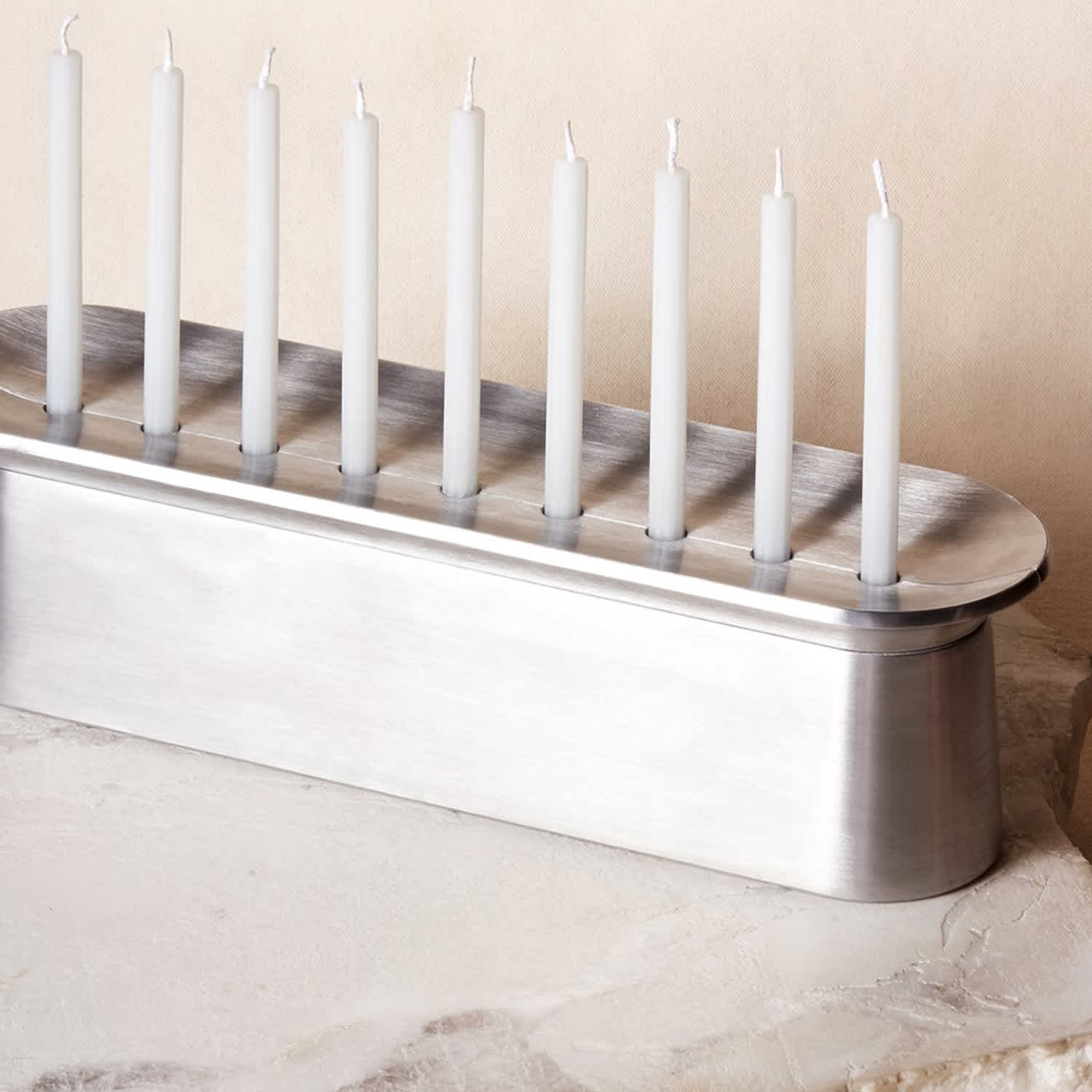 Founded by publicist Dana Hollar Schwartz and designer Jamie Wolfond, Via Maris is a new label producing modern Judaica with a focus on beautiful, functional design. The Trace Chanukiah from the New York label is the most traditional of silhouettes, though uses a matte-finish steel in its construction.