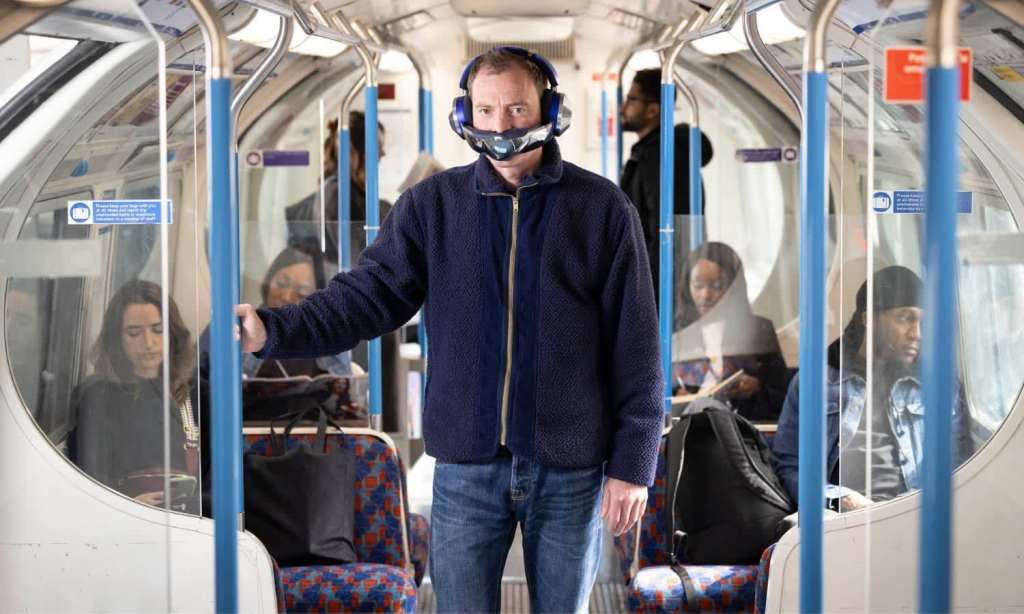 Large, plush headphones cancel the noise around you and play music or podcasts from a Bluetooth-connected device, while an attachable, plastic, mask-type contraption fastened across the wearer’s mouth delivers purified air to their mouth and nose.