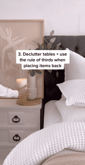 Finally, declutter any tables and surfaces. While Mila again uses an example from a bedroom, the rule can be applied to any tables and surfaces in your home.
