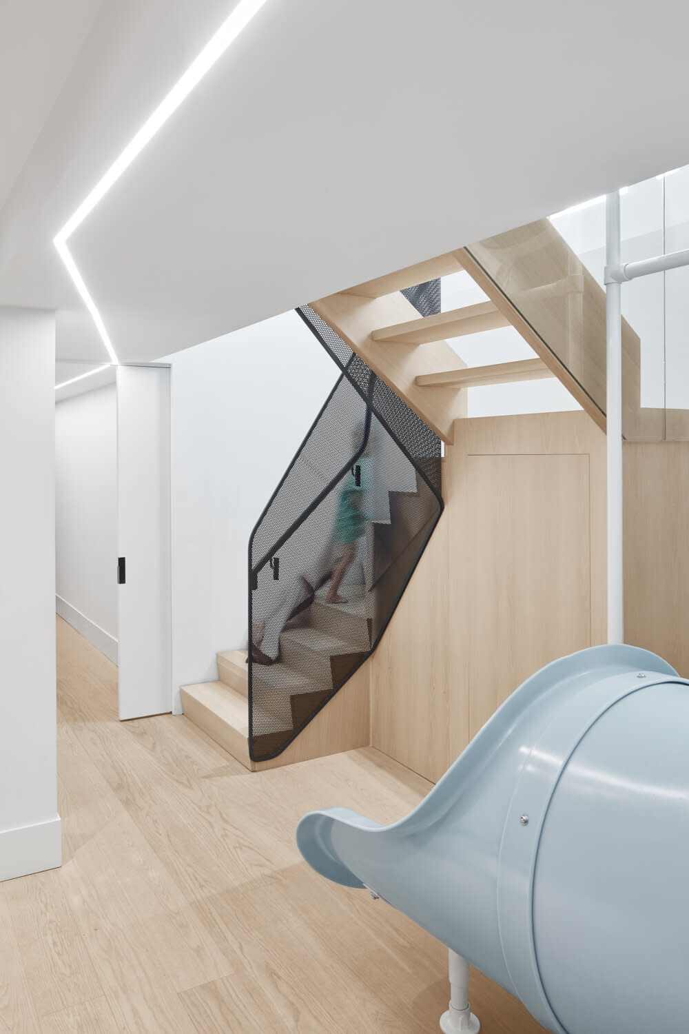 Including a slide was a way for the architects to brighten up the basement level and make it feel more appealing for the couple’s children, however the decision to include a slide was not solely for the kids.