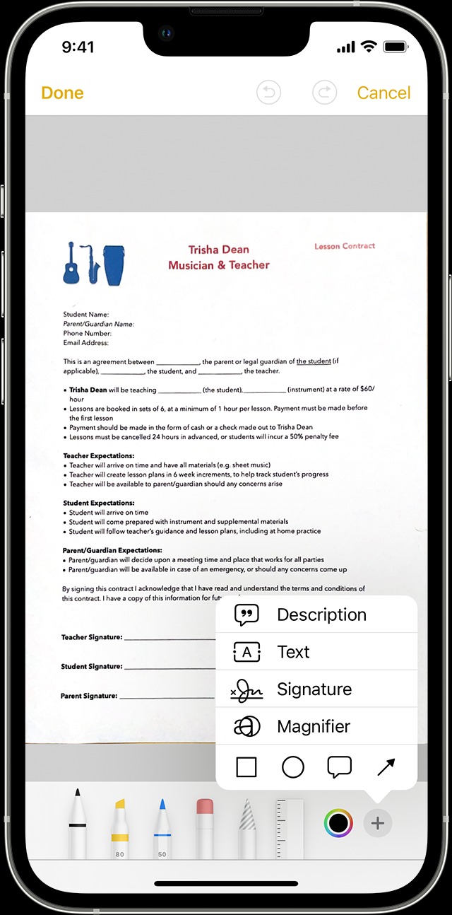 Helpfully, once the document has been uploaded, you can tap the share button, markup, add, and signature to add your saved signature to a document or create a new one. You can then adjust its size and place it where you want it to go in the document.