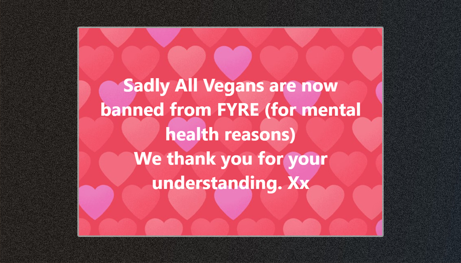 So, that’s the long and the short of it. Well, besides the bit where FYRE weaponised therapy speech in their Facebook post. They originally claimed that they were banning vegans for “mental health reasons.” Experiencing mental health adversity is never a reason to spew hatred.