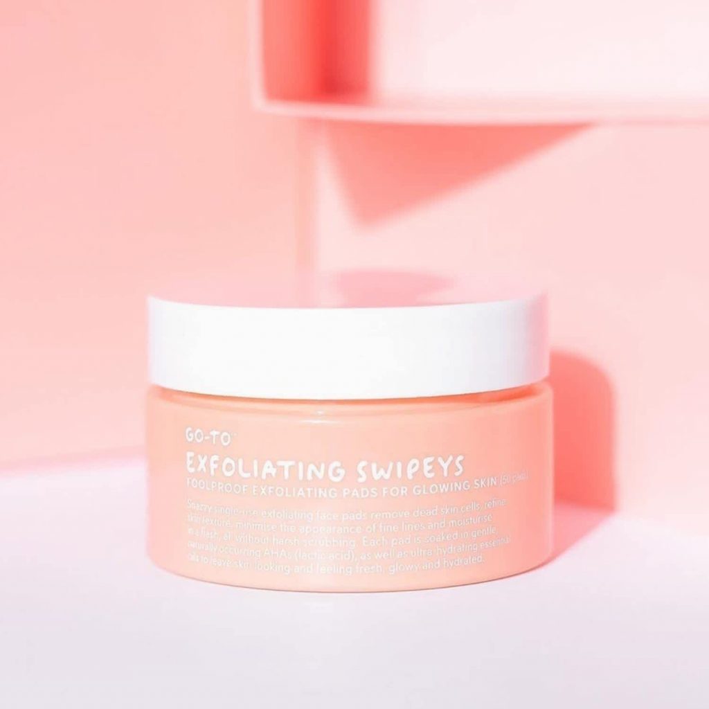 We generally steer clear of physical exfoliators as they can be harsh on the skin, so opt for a chemical exfoliant if you can. Our favourite chemical exfoliant is Go-To’s Exfoliating Swipeys, which are small pads soaked in a solution of lactic acid that helps remove dead skin cells while also hydrating the skin.