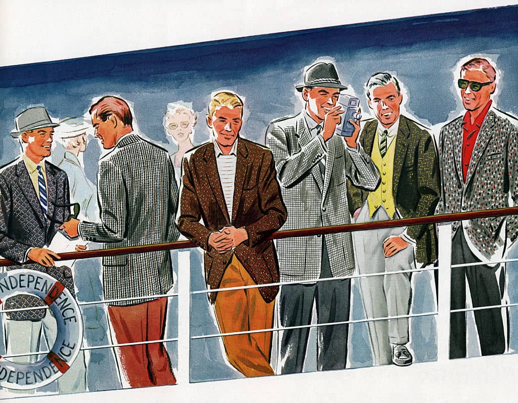 The 50s was mainly brighter single coloured suits but also saw the rise of the sports jacket which could be mixed and matched with differing patterns. Musicians and entertainers wore more extravagant pieces with cross coloured lapels and loose trousers.