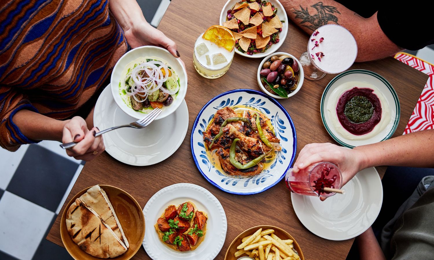 To start, choose from mezze-like hummus with harissa oil, smashed falafel with green goddess tahini, and sumac spiced tuna tartare. Mains include shawarma spiced chicken, halloumi and veggies, and BBQ king prawns with café de Cairo, curry leaf, and lemon.